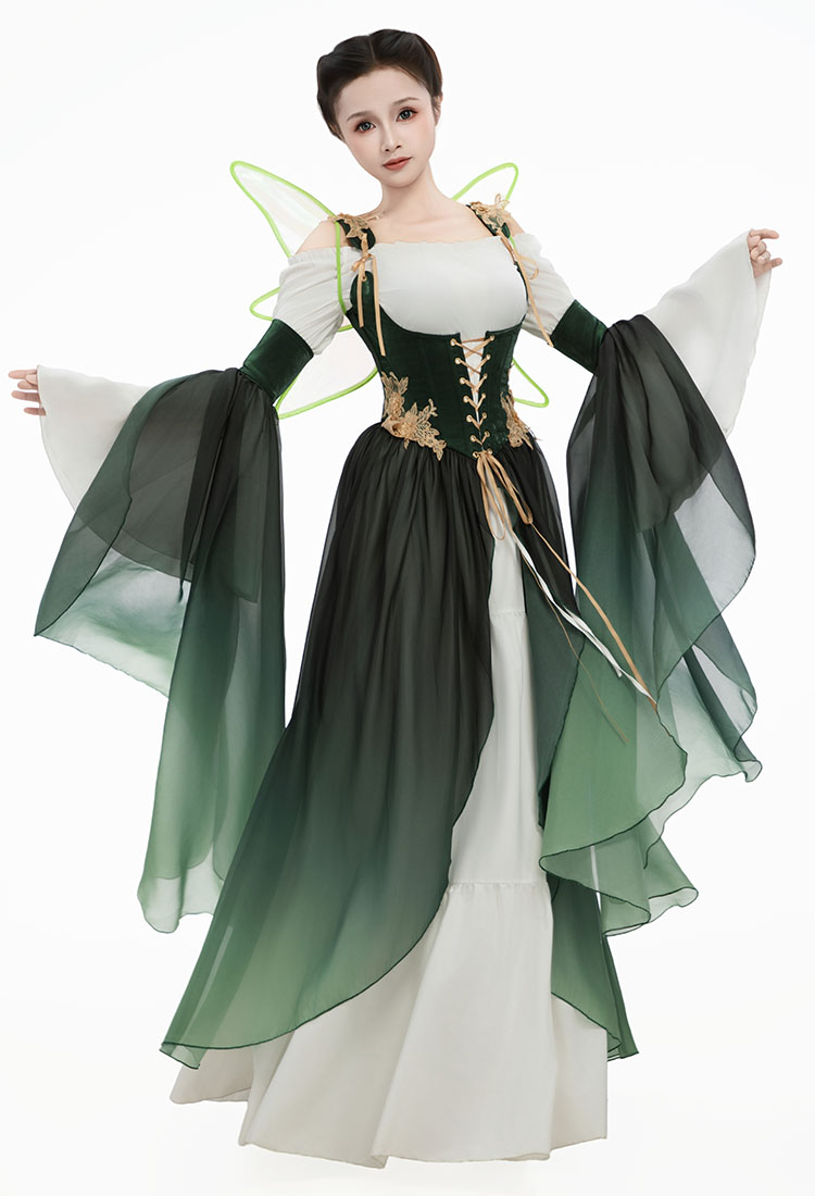 In a fresh shade of gradient green hue, this dress features the off - the - shoulder neckline and fitted bodice contrasts softly with the flowing skirt layers, giving the look a natural, relaxed charm. Silver trims along the neckline add a touch of classical radiance, making it the perfect embodiment of medieval elegance.