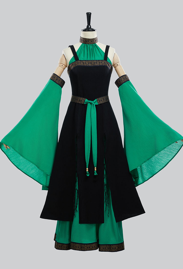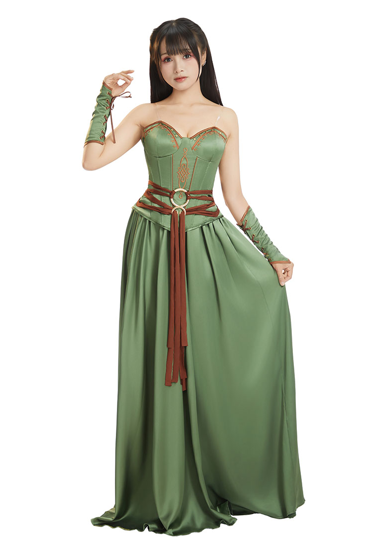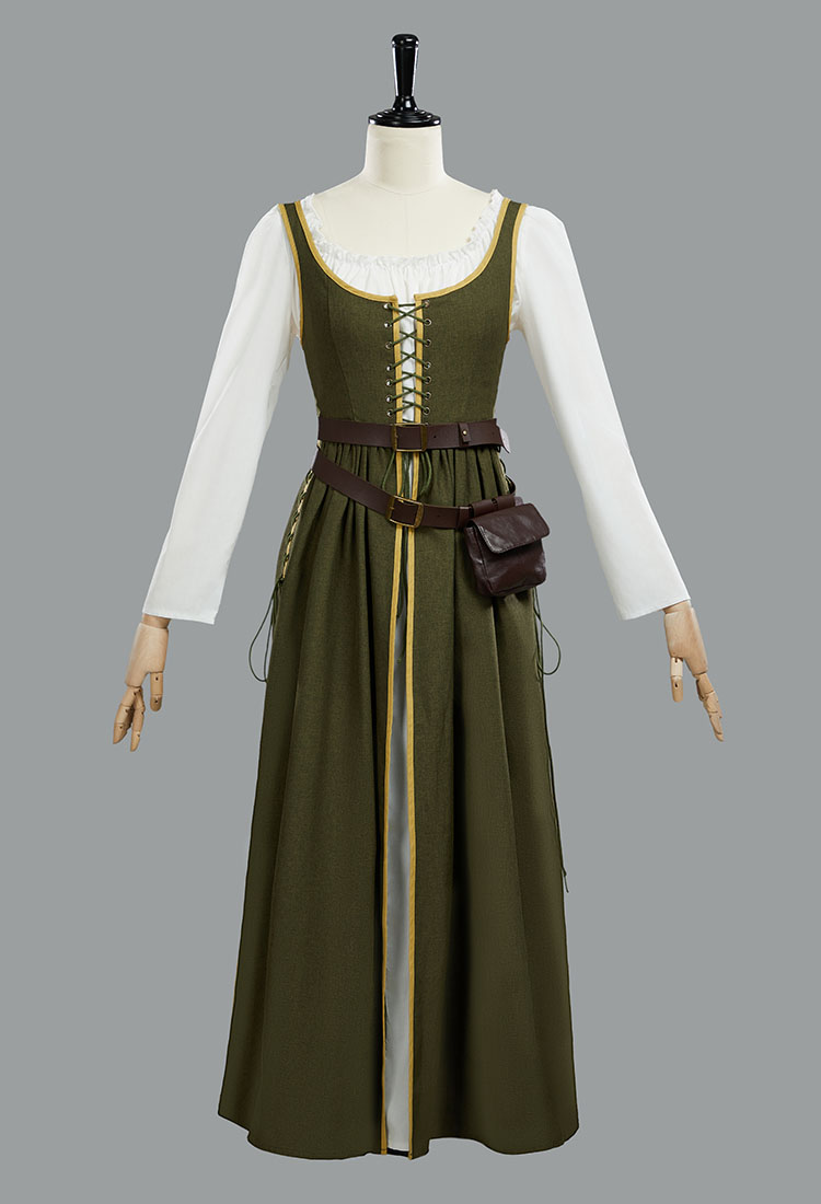 • The second dress also centers on olive green but layers a wine-red over-skirtand incorporates decorative brown leather shoulder armor. These elements introduce a bold, structured contrast to the softness of the dress. When paired with a prop bow and arrow, the look fully embodies the “huntress/warrior” archetype, blending strength with femininity. Ideal for fantasy cosplay or medieval battle-themed gatherings, this design demonstrates how the same color palette can tell two completely different stories—from refined elegance to fierce, adventurous spirit.