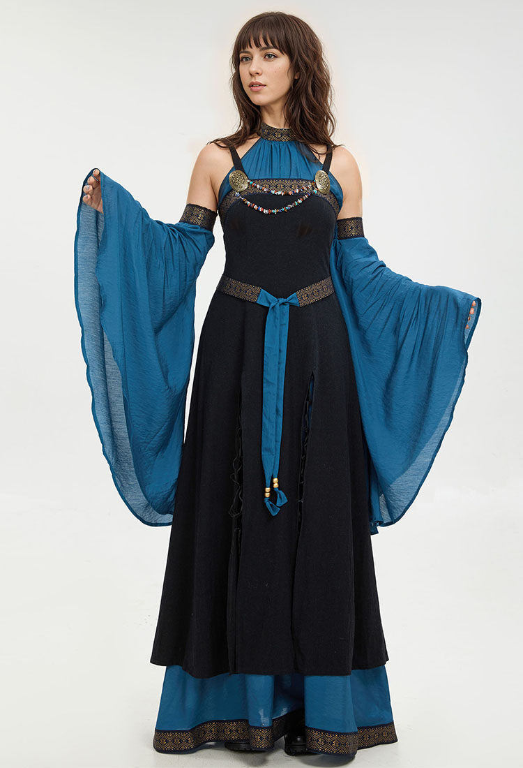 • This dress features a sleeveless halter design paired with flowing detachable wide sleeves, balancing vintage aesthetics with wearability. The main body is rendered in a palette of deep black and rich blue, accented with metallic trims and colored beads at the neckline and waistband. The dress gently reveals an inner slip in a matching hue, adding refined detail and layered texture to the ensemble. The design blends the characteristic drape and decorative motifs of medieval attire, while the wide sleeves lend a touch of graceful movement. Ideal for themed medieval gatherings, historical cosplay, or castle photography, this dress effortlessly evokes an atmosphere of classical elegance.
