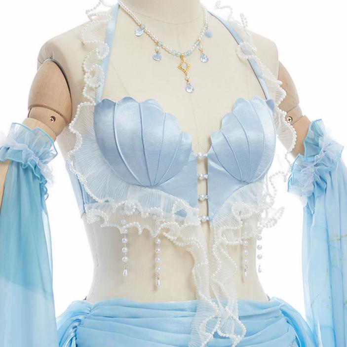 Shell-shaped cups adorned with delicate ruffles and pearl trim, enhancing feminine elegance.